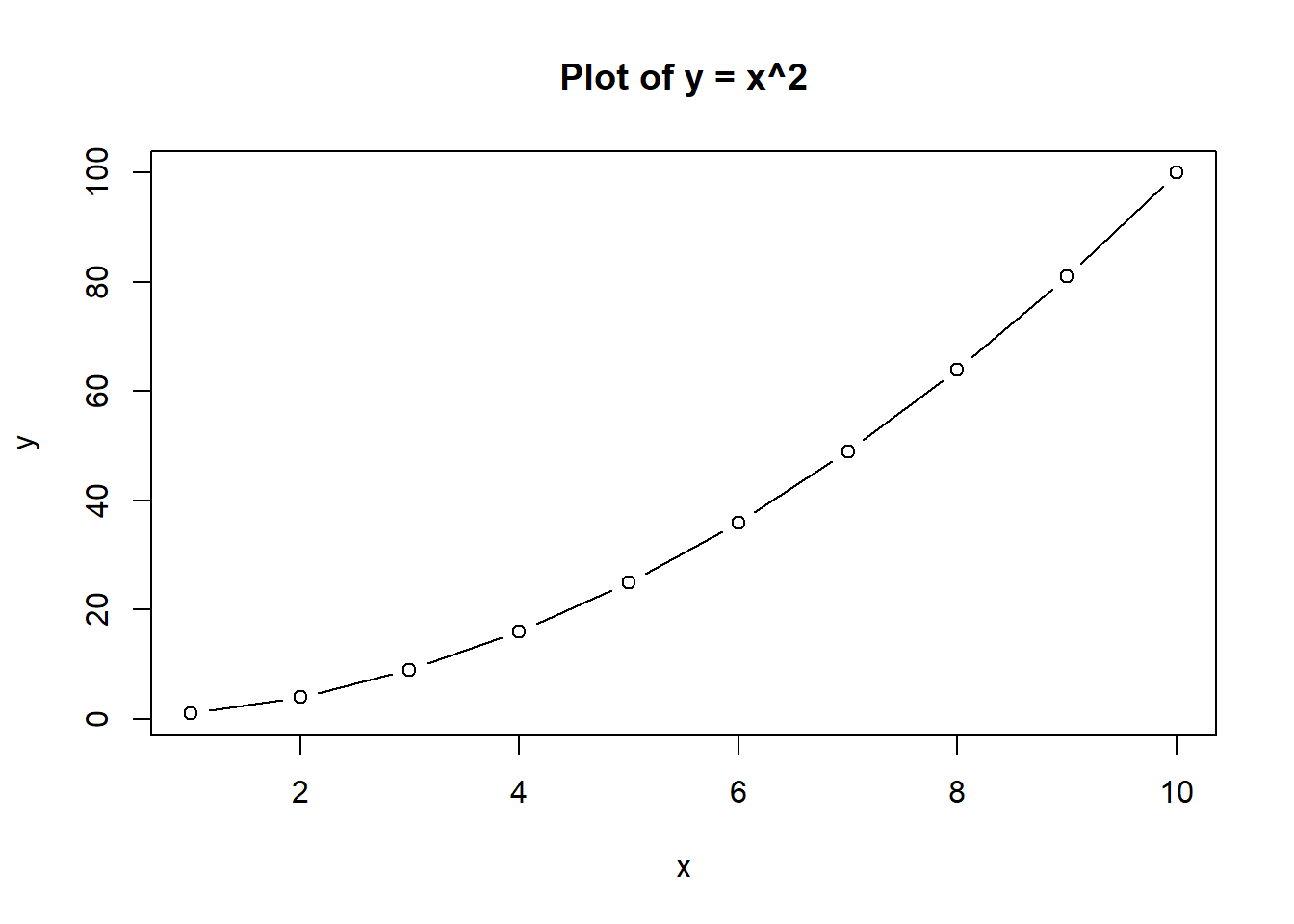 plot(x, y, type = "b", main = "Plot of y = x^2", xlab = "x", ylab = "y")